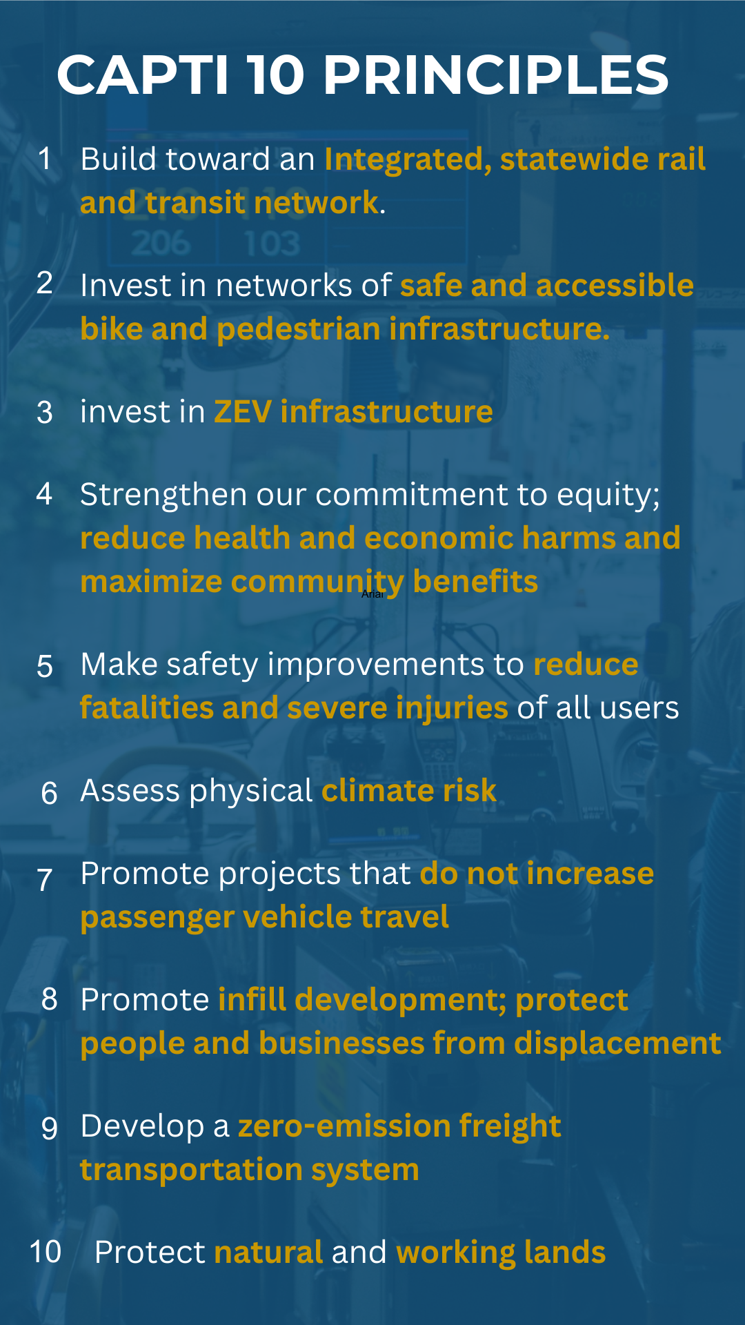 AB 2560 would codify CAPTI’s 10 guiding principles, which lay out how California should invest in projects that create new clean transportation options for people and goods. The principles cover a range of topics, including: prioritizing sustainable transportation projects, infill housing, conservation, vehicle electrification and equity.